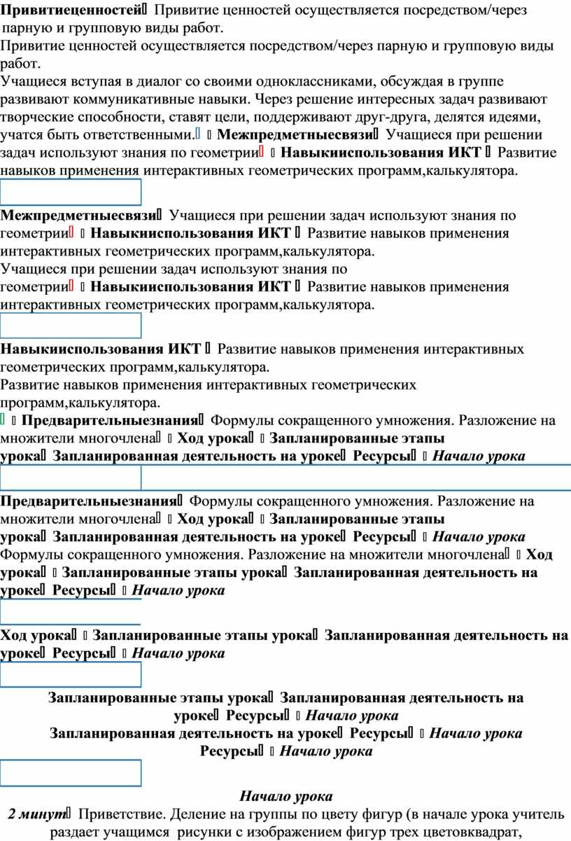 Привитие ценностей осуществляется посредством/через парную и групповую виды работ. Учащиеся вступая в диалог со своими одноклассниками, обсуждая в группе развивают коммуникативные навыки. Через решение интересных задач развивают творческие способности, ставят цели, поддерживают друг-друга, делятся идеями, учатся быть ответственными. |