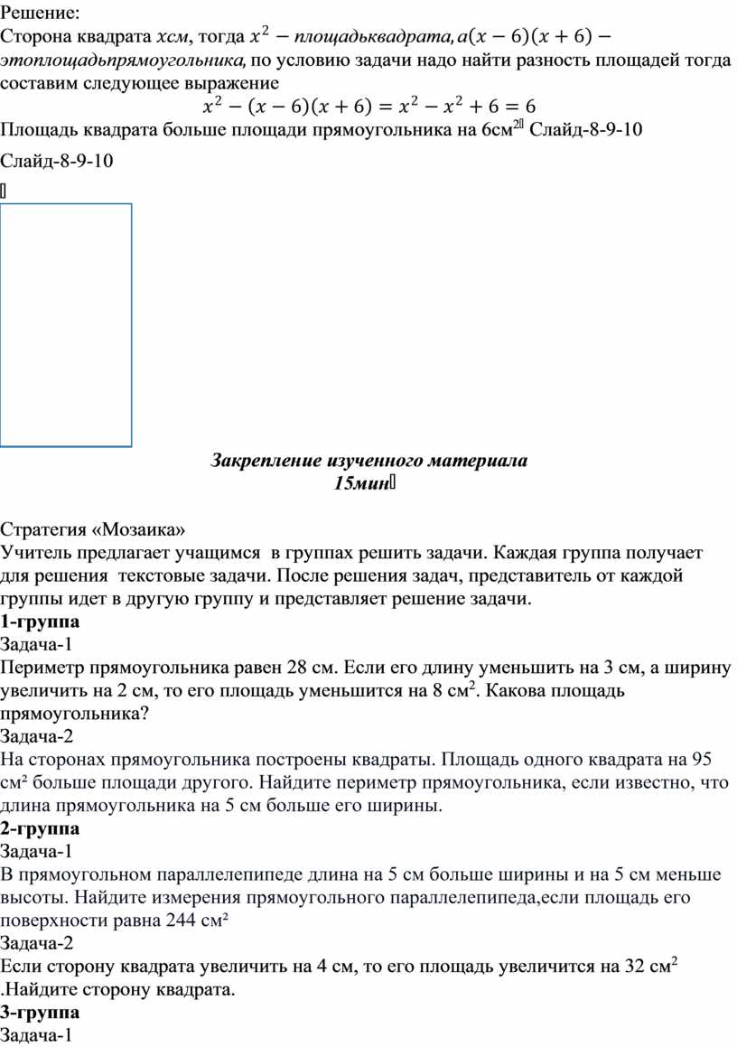 Стратегия «Мозаика» Учитель предлагает учащимся в группах решить задачи. Каждая группа получает для решения текстовые задачи. После решения задач, представитель от каждой группы идет в другую группу и представляет решение задачи. 1-группа Задача-1 Периметр прямоугольника равен 28 см. Если eгo длину уменьшить на 3 см, а ширину увеличить на 2 см, то eгo площадь уменьшится на 8 см2. Какова площадь прямоугольника? Задача-2 На сторонах прямоугольника построены квадраты. Площадь одного квадрата на 95 см² больше площади другого. Найдите периметр прямоугольника, если известно, что длина прямоугольника на 5 см больше его ширины.2-группа Задача-1 В прямоугольном параллелепипеде длина на 5 см больше ширины и на 5 см меньше высоты. Найдите измерения прямоугольного параллелепипеда,если площадь его поверхности равна 244 см²Задача-2 Если сторону квадрата увеличить на 4 см, то его площадь увеличится на 32 см2 .Найдите сторону квадрата. 3-группа Задача-1 Длина прямоугольника на 8 см больше стороны квадрата, а ширина - на 8 см меньше. У какой из фигур площадь больше и на сколько ?Задача-2 Произведение двух чисел, равно квадрату суммы меньшего числа и 12-ти, а среднее арифметическое этих чисел на 24 больше меньшего числа. Найдите эти числа. Критерии оценивания: -вводит переменную -правильно устанавливает связь между данными -правильно составляет математическую модель -правильно решает уравнение -верно выбирает подходящий ответ |