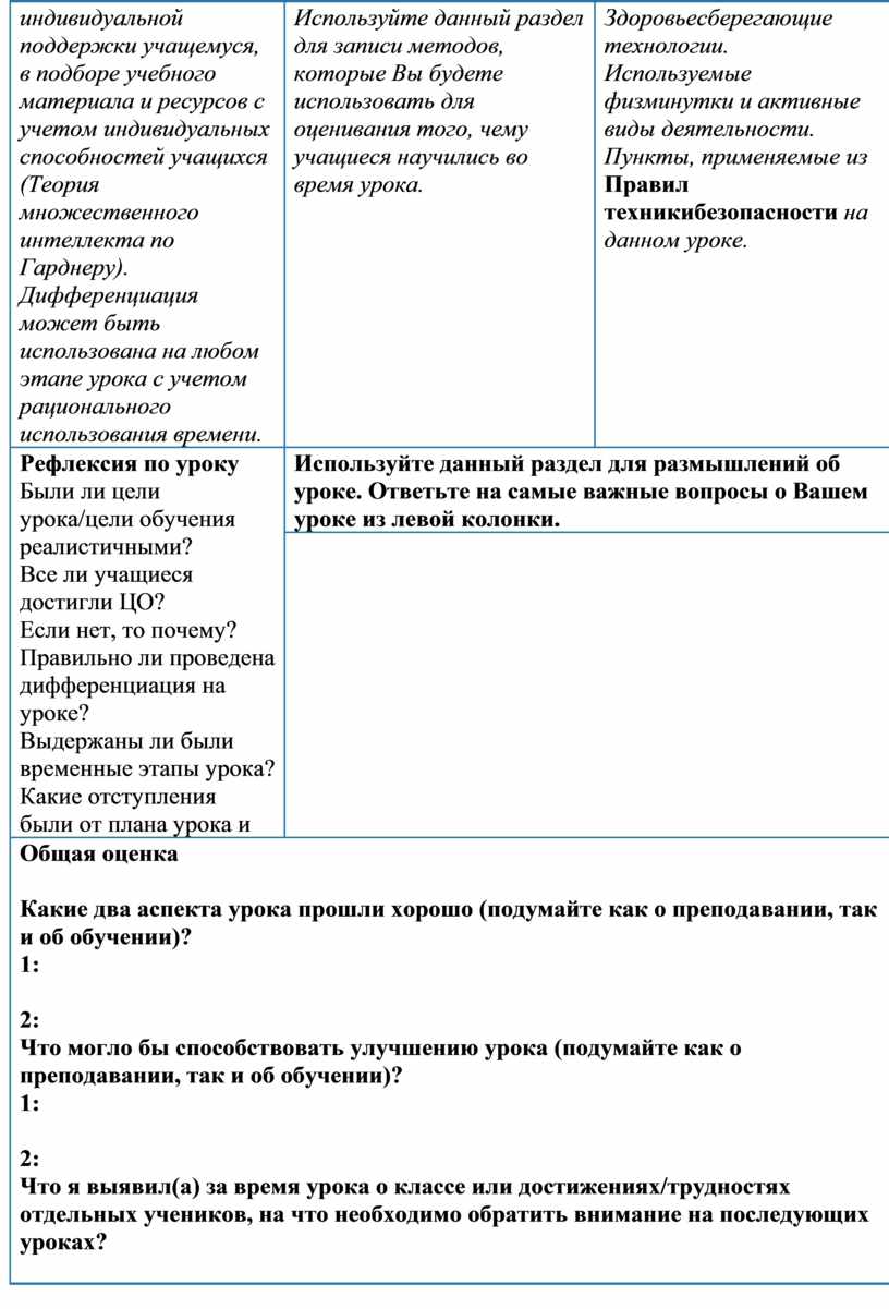 Рефлексия по уроку Были ли цели урока/цели обучения реалистичными? Все ли учащиеся достигли ЦО? Если нет, то почему? Правильно ли проведена дифференциация на уроке? Выдержаны ли были временные этапы урока? Какие отступления были от плана урока и |