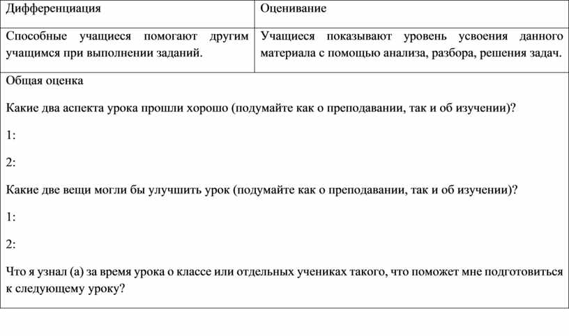 Общая оценка Какие два аспекта урока прошли хорошо (подумайте как о преподавании, так и об изучении)? 1: 2: Какие две вещи могли бы улучшить урок (подумайте как о преподавании, так и об изучении)? 1: 2: Что я узнал (а) за время урока о классе или отдельных учениках такого, что поможет мне подготовиться к следующему уроку? |
