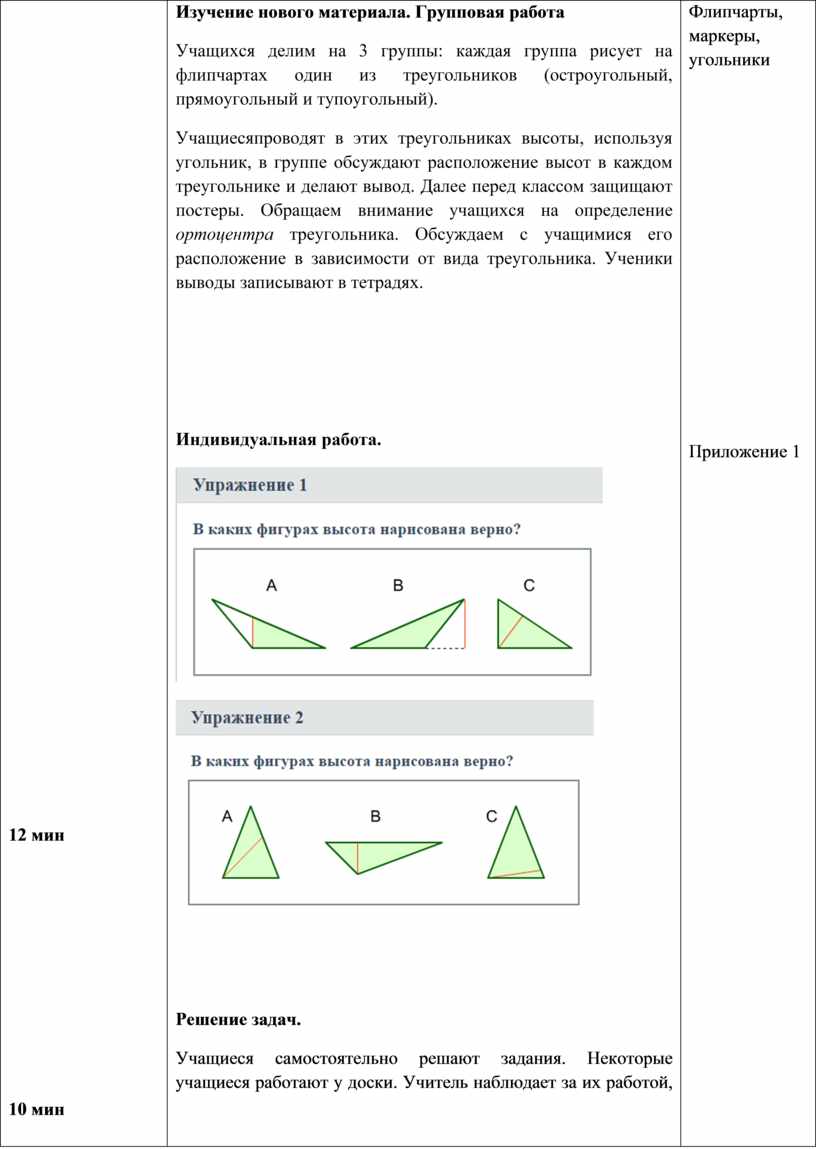 Изучение нового материала. Групповая работа Учащихся делим на 3 группы: каждая группа рисует на флипчартах один из треугольников (остроугольный, прямоугольный и тупоугольный). Учащиесяпроводят в этих треугольниках высоты, используя угольник, в группе обсуждают расположение высот в каждом треугольнике и делают вывод. Далее перед классом защищают постеры. Обращаем внимание учащихся на определение ортоцентра треугольника. Обсуждаем с учащимися его расположение в зависимости от вида треугольника. Ученики выводы записывают в тетрадях.