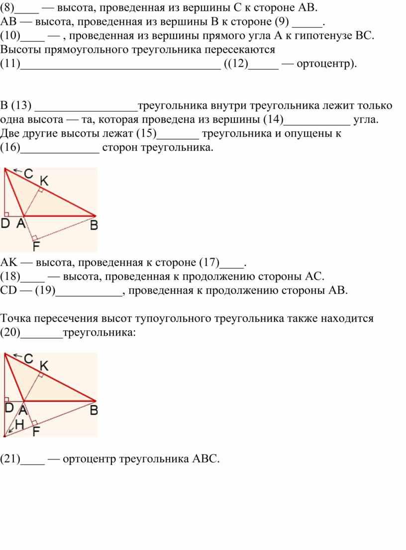 Высотой треугольника называется (1)______________, проведенный из вершины треугольника к прямой, содержащей противолежащую сторону.