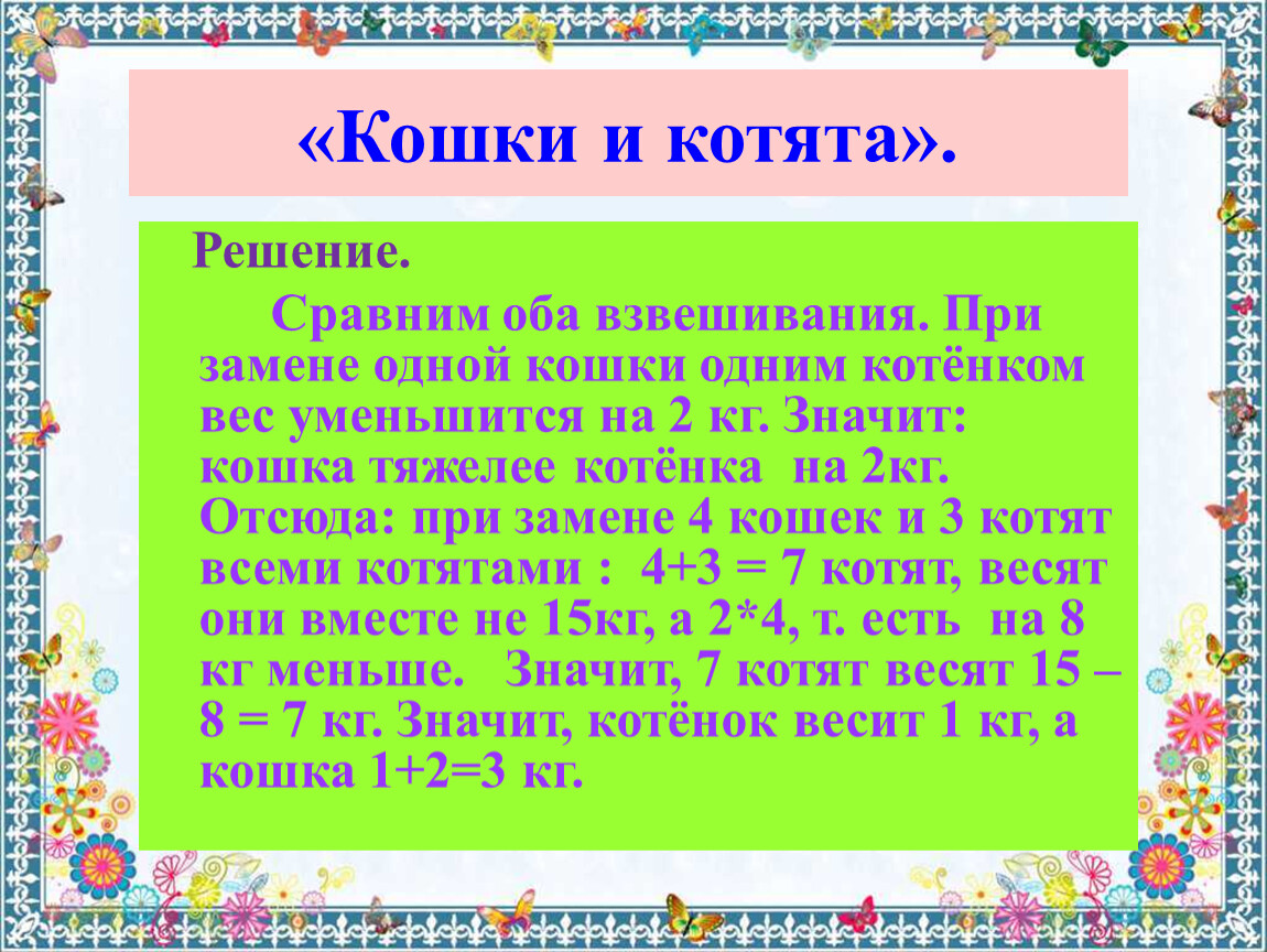 Сравним оба взвешивания. При замене одной кошки одним котёнком вес уменьшится на 2 кг. Значит: кошка тяжелее котёнка на 2кг. Отсюда: при замене 4 кошек и 3 котят всеми котятами : 4+3 = 7 котят, весят они вместе не 15кг, а 2*4, т. есть на 8 кг меньше. Значит, 7 котят весят 15 – 8 = 7 кг. Значит, котёнок весит 1 кг, а кошка 1+2=3 кг.