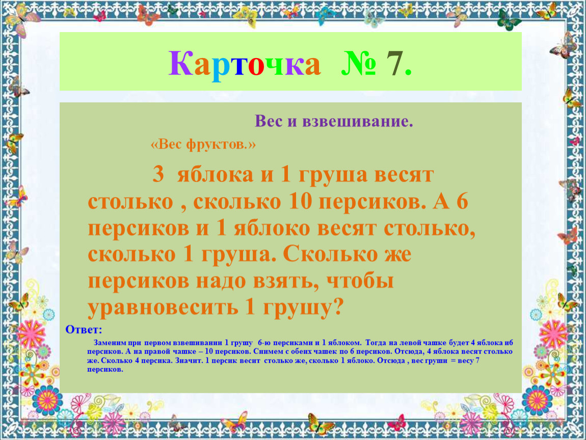 Заменим при первом взвешивании 1 грушу 6-ю персиками и 1 яблоком. Тогда на левой чашке будет 4 яблока и6 персиков. А на правой чашке – 10 персиков. Снимем с обеих чашек по 6 персиков. Отсюда, 4 яблока весят столько же. Сколько 4 персика. Значит. 1 персик весит столько же, сколько 1 яблоко. Отсюда , вес груши = весу 7 персиков.