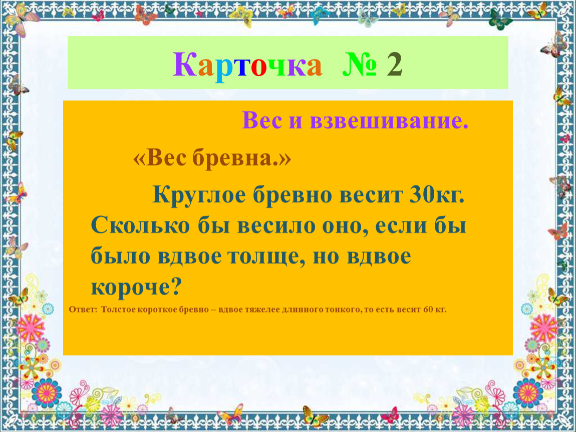 Ответ: Толстое короткое бревно – вдвое тяжелее длинного тонкого, то есть весит 60 кг.