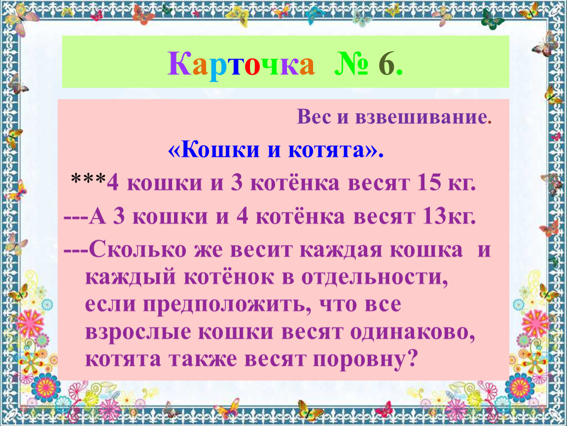 ---Сколько же весит каждая кошка и каждый котёнок в отдельности, если предположить, что все взрослые кошки весят одинаково, котята также весят поровну?