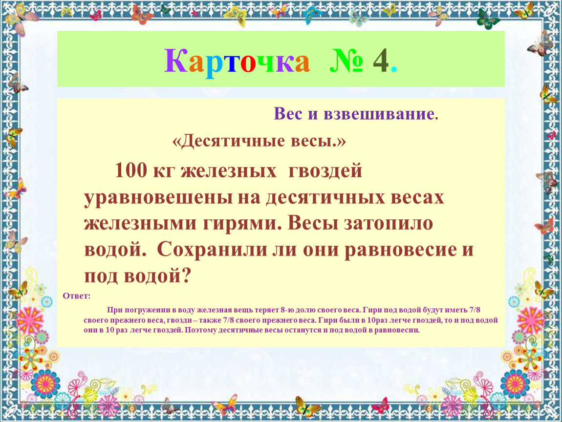 При погружении в воду железная вещь теряет 8-ю долю своего веса. Гири под водой будут иметь 7/8 своего прежнего веса, гвозди – также 7/8 своего прежнего веса. Гири были в 10раз легче гвоздей, то и под водой они в 10 раз легче гвоздей. Поэтому десятичные весы останутся и под водой в равновесии.