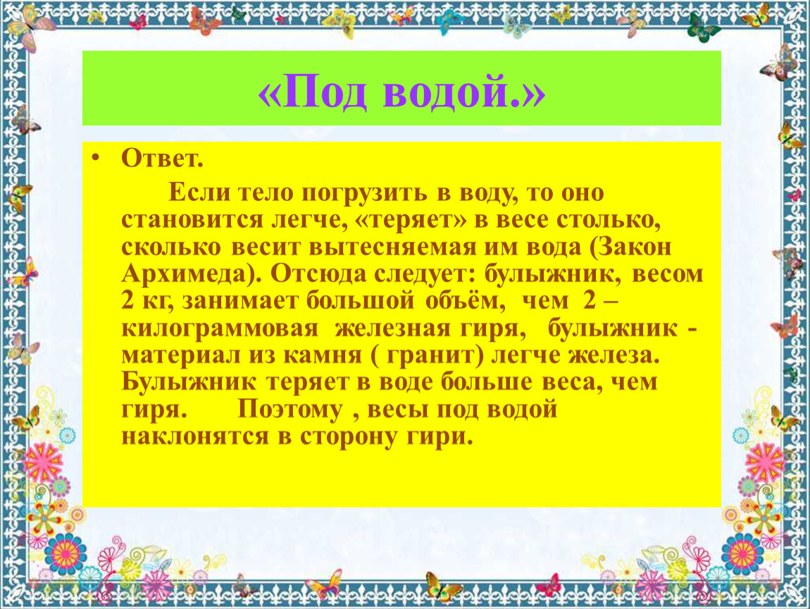 Если тело погрузить в воду, то оно становится легче, «теряет» в весе столько, сколько весит вытесняемая им вода (Закон Архимеда). Отсюда следует: булыжник, весом 2 кг, занимает большой объём, чем 2 –килограммовая железная гиря, булыжник - материал из камня ( гранит) легче железа. Булыжник теряет в воде больше веса, чем гиря. Поэтому , весы под водой наклонятся в сторону гири.