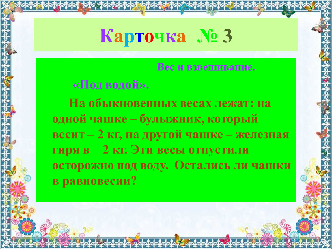 На обыкновенных весах лежат: на одной чашке – булыжник, который весит – 2 кг, на другой чашке – железная гиря в 2 кг. Эти весы отпустили осторожно под воду. Остались ли чашки в равновесии?