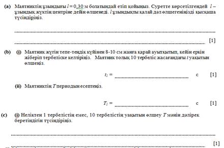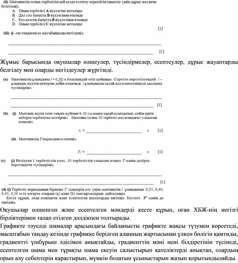 Оқушылар суретке қарап математикалық маятникті орнатады. Үлестірмелі парақтағы тапсырмаларды ретімен орындайды. Тапсырмалар бірізгілікті, сыртқы жиынтық бағалаудағы талаптарға сай жасалған. Әрбір іс-әрекеттері 20 баллдық жүйемен бағаланады.
