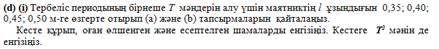 -Математикалық маятниктің формуласынан еркін түсу үдеуін анықтау; -Периодтың квадраты маятниктің ұзындығынан тәуелділік графигін тұрғызу және талдау; -Алынған нәтижелерді түсіндіру және қорытынды жасау. |