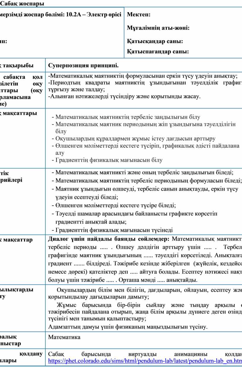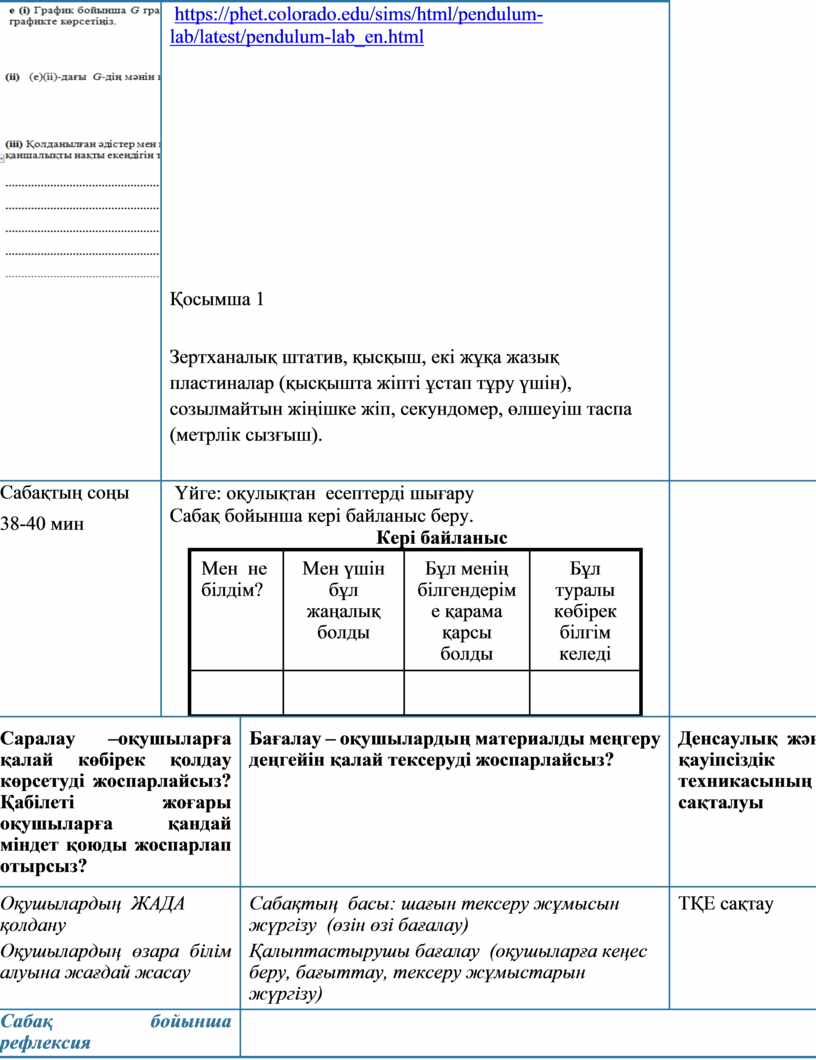 Сабақ барысында виртуалды анимацияны қолдану https://phet.colorado.edu/sims/html/pendulum-lab/latest/pendulum-lab_en.html |