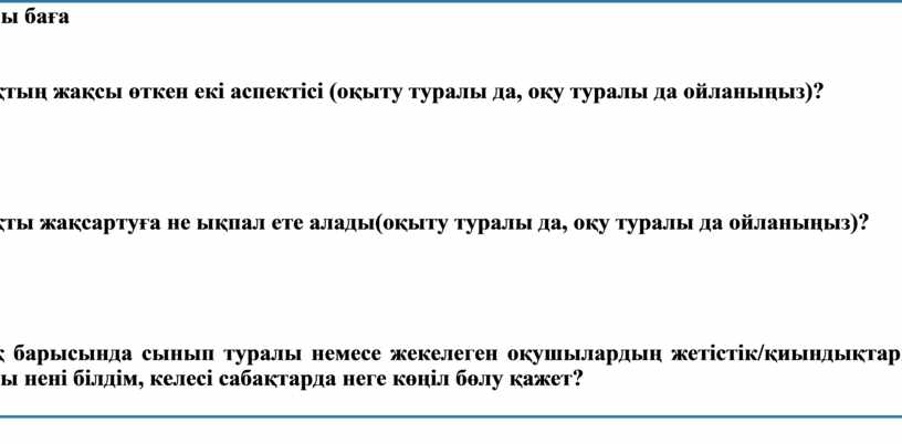 Сабақ мақсаттары/оқу мақсаттары дұрыс қойылғанба? Оқушылардың барлығы ОМ қолжеткіздіме? Жеткізбесе, неліктен? Сабақта саралау дұрыс жүргізілдіме? Сабақтың уақыттық кезеңдері сақталдыма? Сабақ жоспарынан қандай ауытқулар болды, неліктен? |
