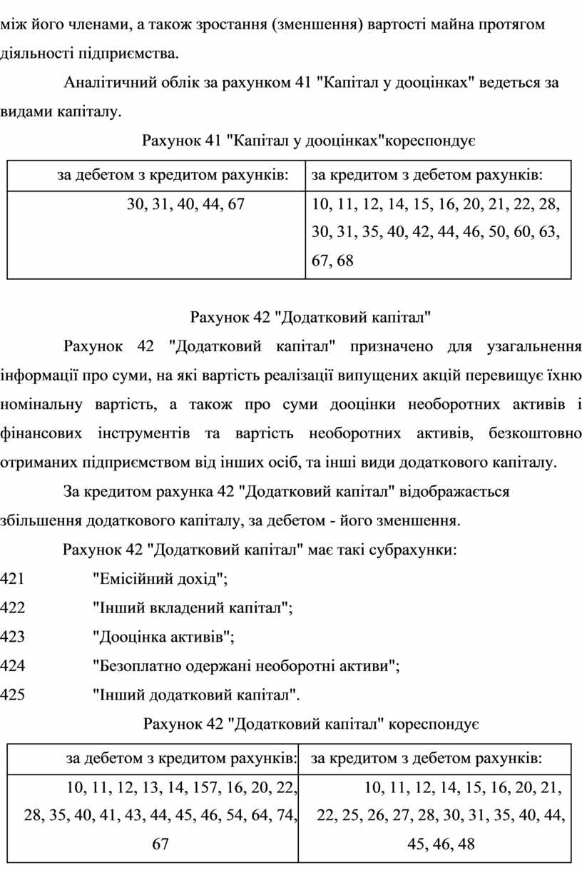 Рахунок 42 "Додатковий капітал" призначено для узагальнення інформації про суми, на які вартість реалізації випущених акцій перевищує їхню номінальну вартість, а також про суми дооцінки необоротних активів і фінансових інструментів та вартість необоротних активів, безкоштовно отриманих підприємством від інших осіб, та інші види додаткового капіталу.