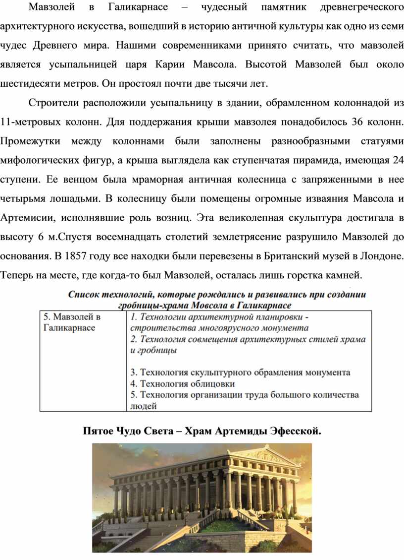 - составлена таблица семи чудес света, в которой систематизированы время и место создания каждого из чудес света.