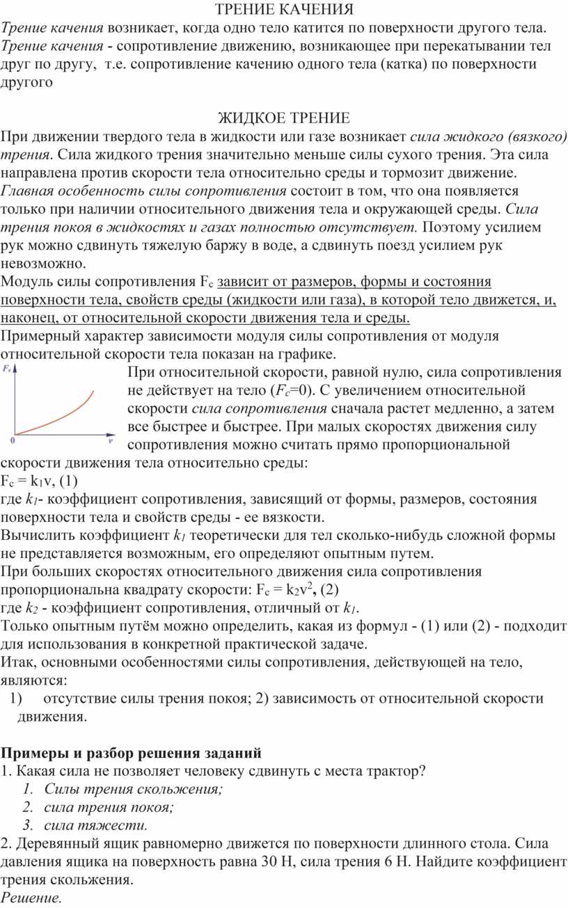 Модуль силы сопротивления Fc зависит от размеров, формы и состояния поверхности тела, свойств среды (жидкости или газа), в которой тело движется, и, наконец, от относительной скорости движения тела и среды.