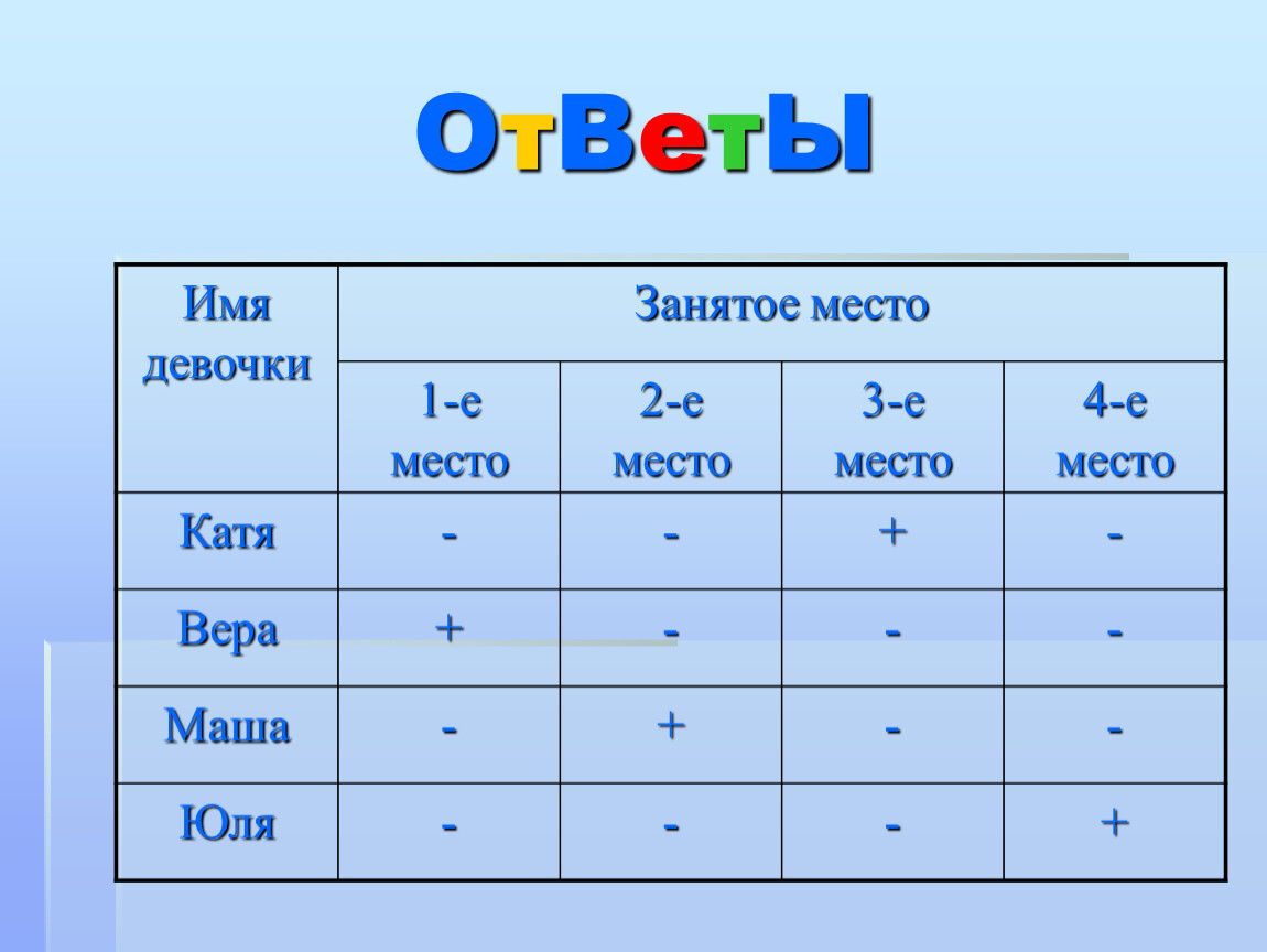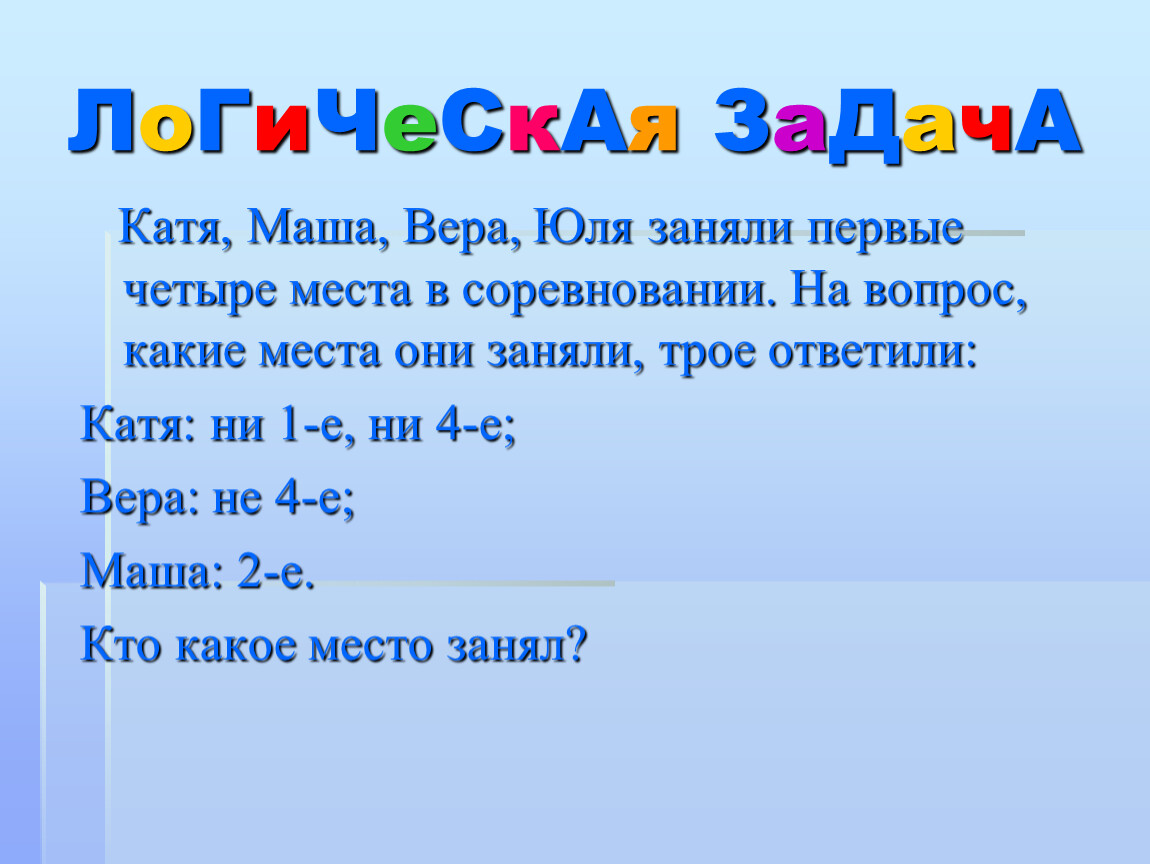 Катя, Маша, Вера, Юля заняли первые четыре места в соревновании. На вопрос, какие места они заняли, трое ответили: