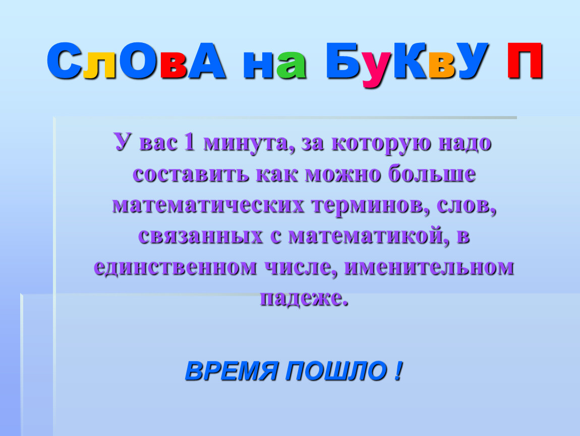У вас 1 минута, за которую надо составить как можно больше математических терминов, слов, связанных с математикой, в единственном числе, именительном падеже.