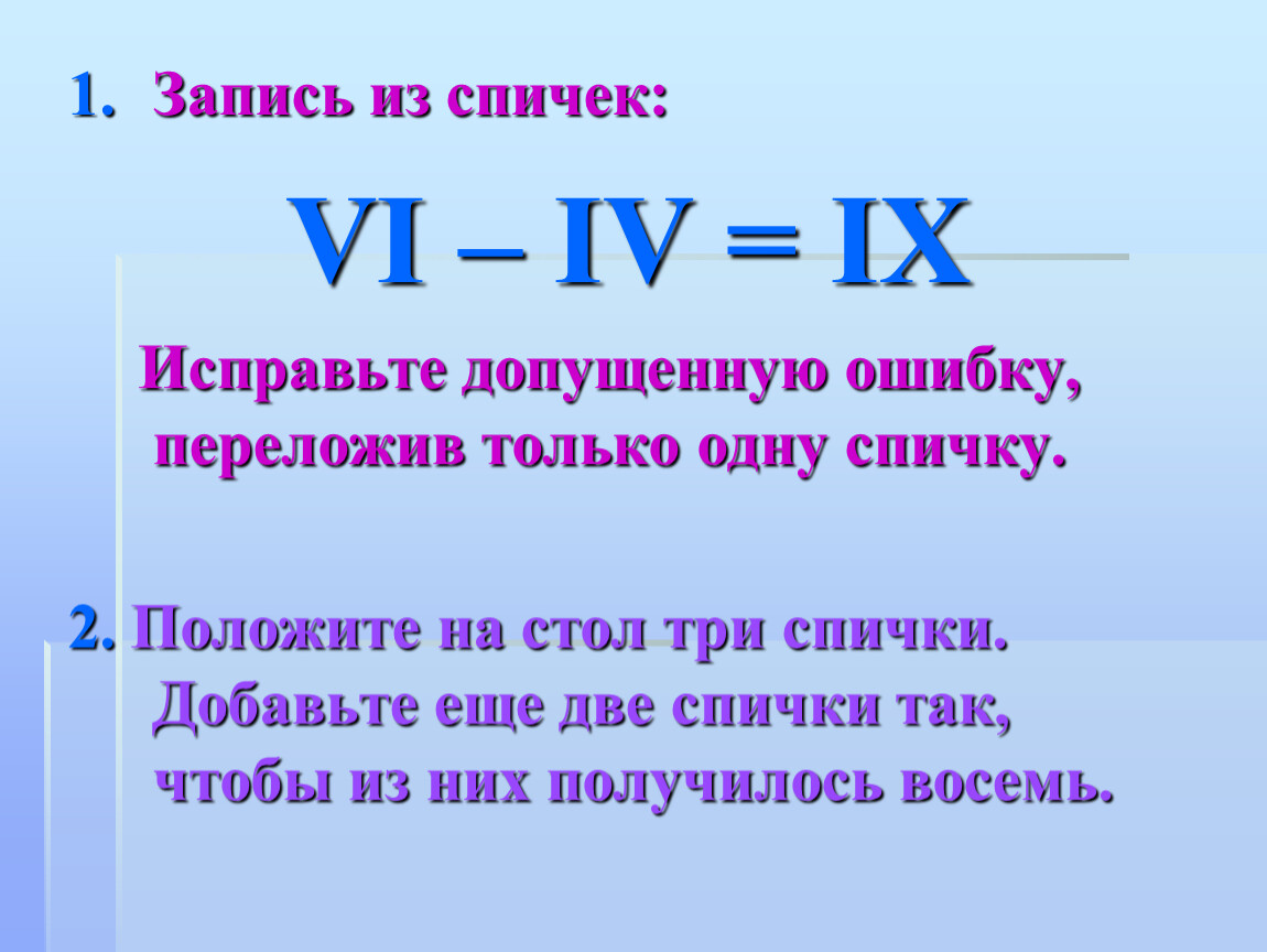 Исправьте допущенную ошибку, переложив только одну спичку.