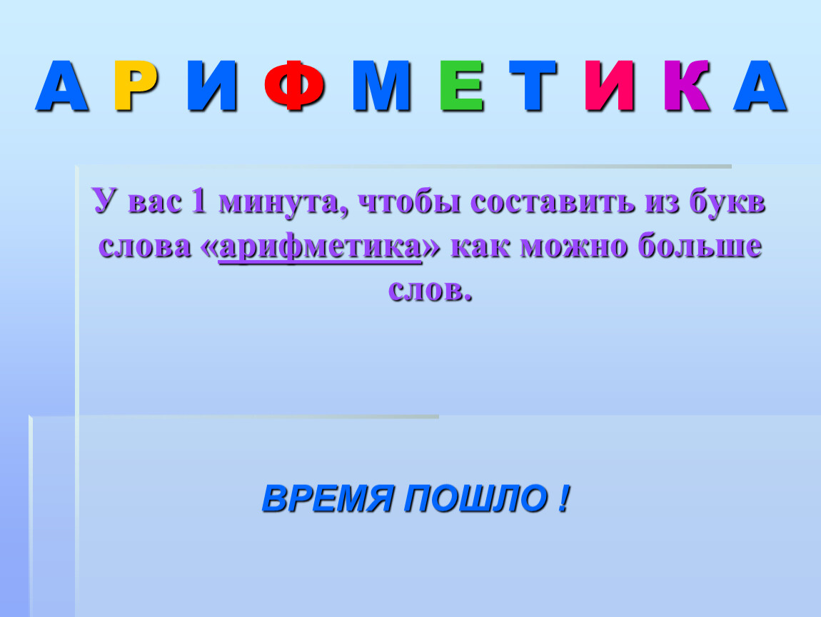 У вас 1 минута, чтобы составить из букв слова «арифметика» как можно больше слов.