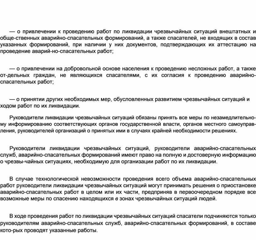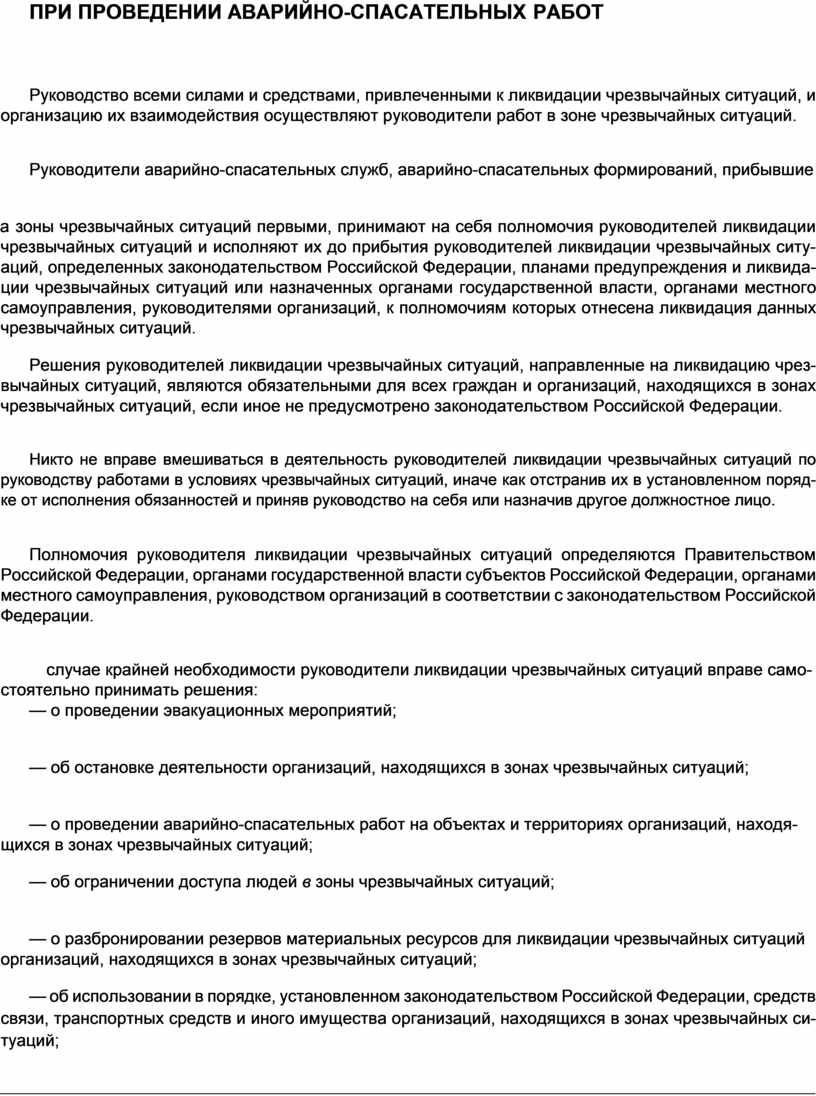 Решения руководителей ликвидации чрезвычайных ситуаций, направленные на ликвидацию чрез-вычайных ситуаций, являются обязательными для всех граждан и организаций, находящихся в зонах чрезвычайных ситуаций, если иное не предусмотрено законодательством Российской Федерации.