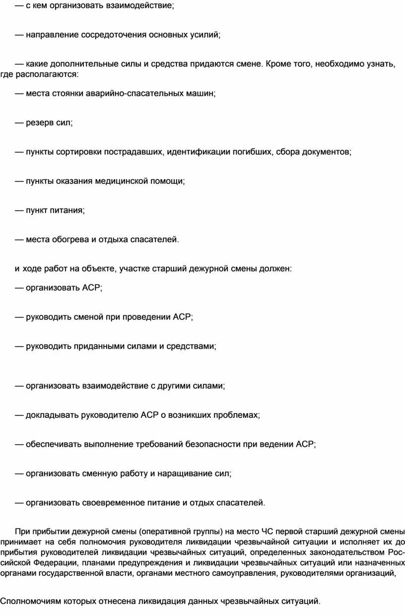 При прибытии дежурной смены (оперативной группы) на место ЧС первой старший дежурной смены принимает на себя полномочия руководителя ликвидации чрезвычайной ситуации и исполняет их до прибытия руководителей ликвидации чрезвычайных ситуаций, определенных законодательством Рос-сийской Федерации, планами предупреждения и ликвидации чрезвычайных ситуаций или назначенных органами государственной власти, органами местного самоуправления, руководителями организаций,