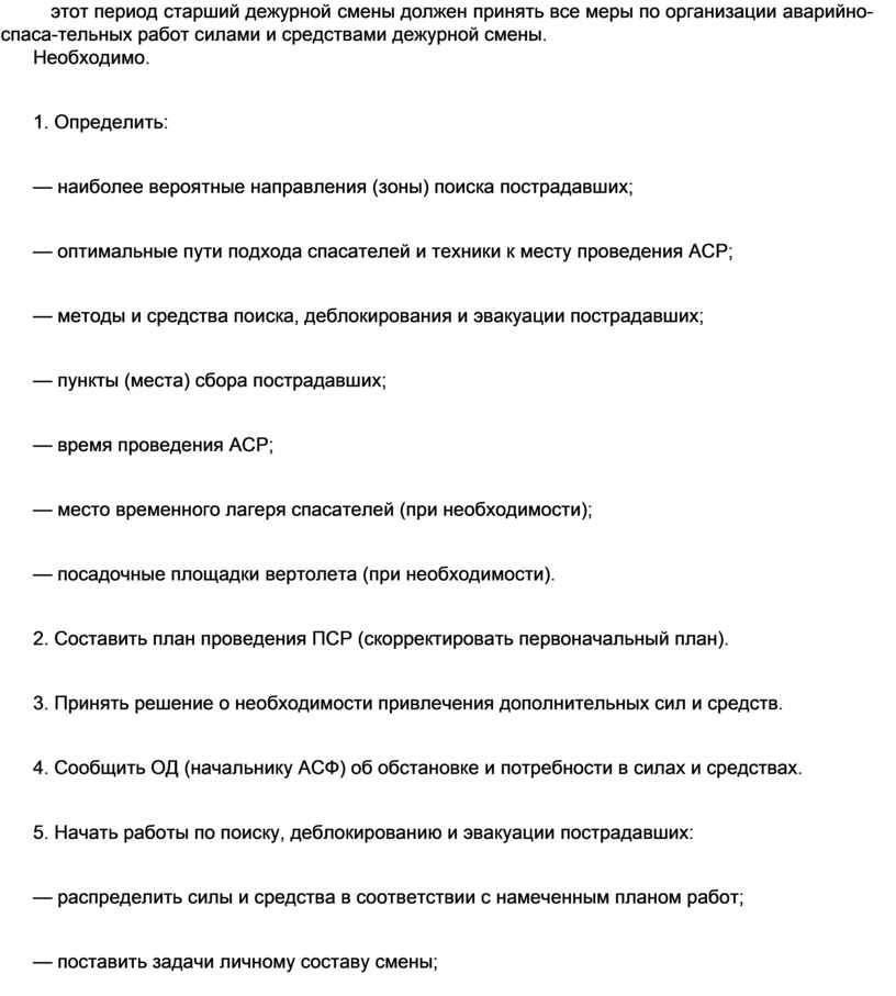 этот период старший дежурной смены должен принять все меры по организации аварийно-спаса-тельных работ силами и средствами дежурной смены.