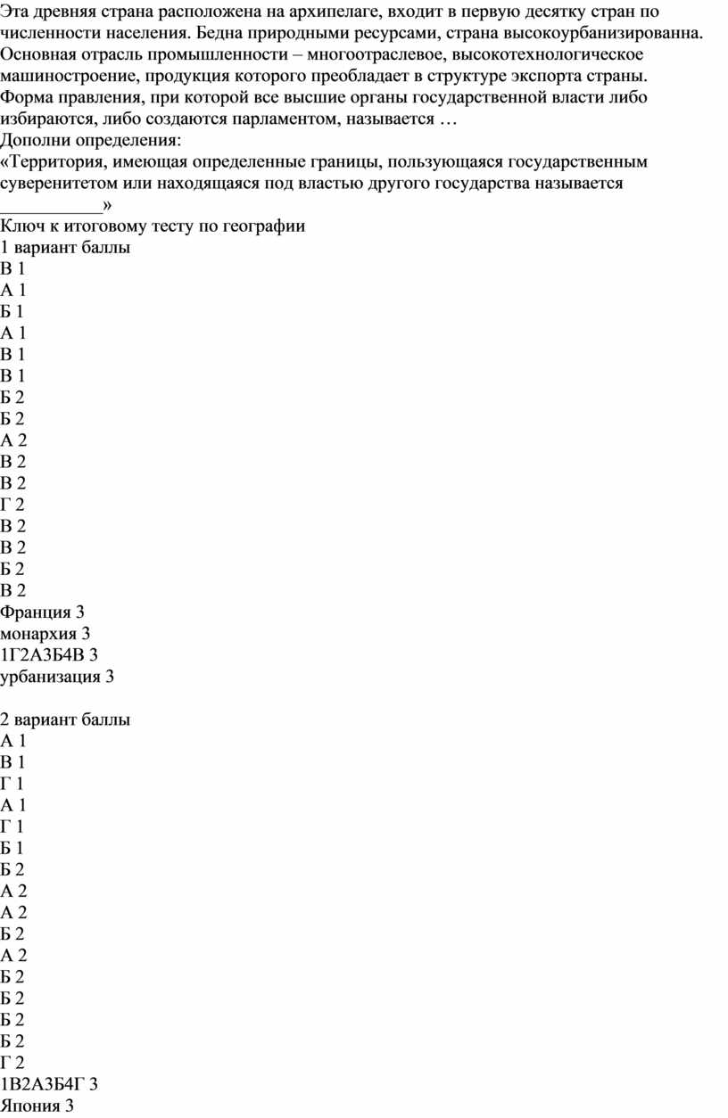 Ключ к итоговому тесту по географии