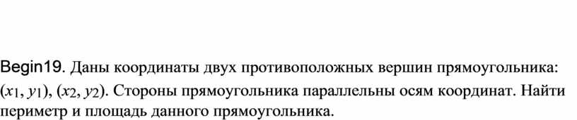 Begin19. Даны координаты двух противоположных вершин прямоугольника: (x1, y1), (x2, y2). Стороны прямоугольника параллельны осям координат. Найти периметр и площадь данного прямоугольника.