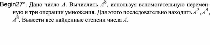 Begin27°. Дано число A. Вычислить A8, используя вспомогательную перемен-ную и три операции умножения. Для этого последовательно находить A2, A4, A8. Вывести все найденные степени числа A.