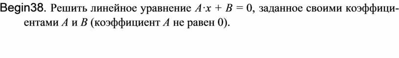 Begin38. Решить линейное уравнение A·x + B = 0, заданное своими коэффици-ентами A и B (коэффициент A не равен 0).