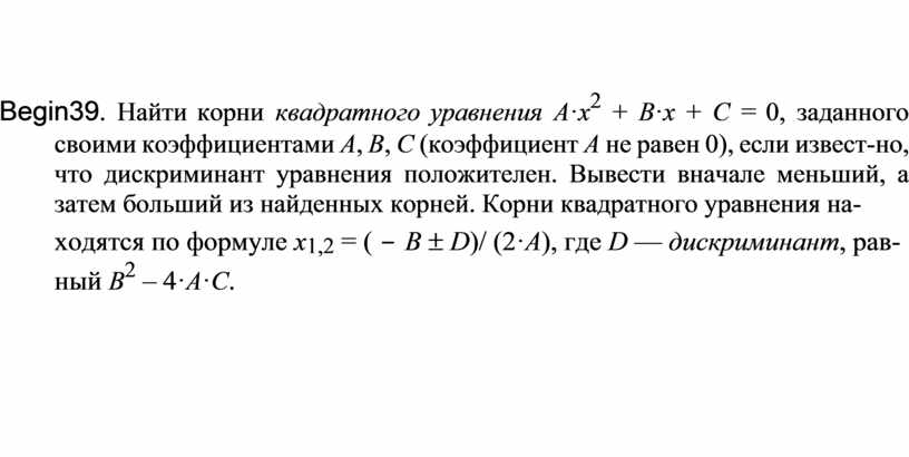 Begin39. Найти корни квадратного уравнения A·x2 + B·x + C = 0, заданного своими коэффициентами A, B, C (коэффициент A не равен 0), если извест-но, что дискриминант уравнения положителен. Вывести вначале меньший, а затем больший из найденных корней. Корни квадратного уравнения на-