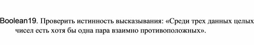 Boolean19. Проверить истинность высказывания: «Среди трех данных целых чисел есть хотя бы одна пара взаимно противоположных».