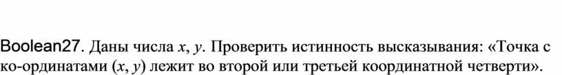 Boolean27. Даны числа x, y. Проверить истинность высказывания: «Точка с ко-ординатами (x, y) лежит во второй или третьей координатной четверти».