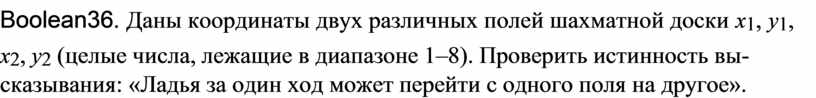 Boolean36. Даны координаты двух различных полей шахматной доски x1, y1, x2, y2 (целые числа, лежащие в диапазоне 1–8). Проверить истинность вы-сказывания: «Ладья за один ход может перейти с одного поля на другое».