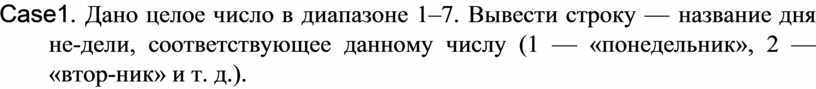 Case1. Дано целое число в диапазоне 1–7. Вывести строку — название дня не-дели, соответствующее данному числу (1 — «понедельник», 2 — «втор-ник» и т. д.).