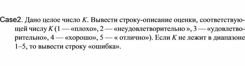 Case2. Дано целое число K. Вывести строку-описание оценки, соответствую-щей числу K (1 — «плохо», 2 — «неудовлетворительно », 3 — «удовлетво-рительно», 4 — «хорошо», 5 — « отлично»). Если K не лежит в диапазоне 1–5, то вывести строку «ошибка».