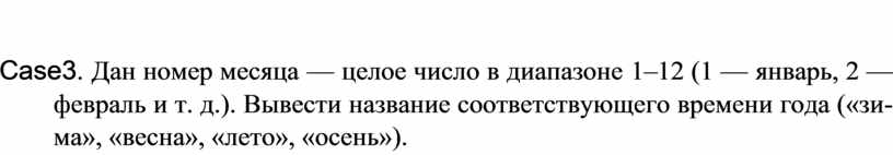 Case3. Дан номер месяца — целое число в диапазоне 1–12 (1 — январь, 2 — февраль и т. д.). Вывести название соответствующего времени года («зи-ма», «весна», «лето», «осень»).