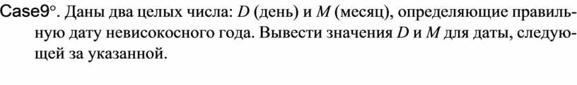 Case9°. Даны два целых числа: D (день) и M (месяц), определяющие правиль-ную дату невисокосного года. Вывести значения D и M для даты, следую-щей за указанной.