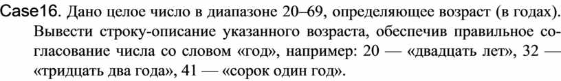 Case16. Дано целое число в диапазоне 20–69, определяющее возраст (в годах). Вывести строку-описание указанного возраста, обеспечив правильное со-гласование числа со словом «год», например: 20 — «двадцать лет», 32 — «тридцать два года», 41 — «сорок один год».