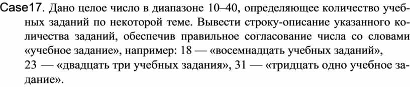 Case17. Дано целое число в диапазоне 10–40, определяющее количество учеб-ных заданий по некоторой теме. Вывести строку-описание указанного ко-личества заданий, обеспечив правильное согласование числа со словами «учебное задание», например: 18 — «восемнадцать учебных заданий»,