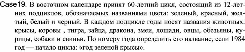 Case19. В восточном календаре принят 60-летний цикл, состоящий из 12-лет-них подциклов, обозначаемых названиями цвета: зеленый, красный, жел-тый, белый и черный. В каждом подцикле годы носят названия животных: крысы, коровы , тигра, зайца, дракона, змеи, лошади, овцы, обезьяны, ку-рицы, собаки и свиньи. По номеру года определить его название, если 1984 год — начало цикла: «год зеленой крысы».