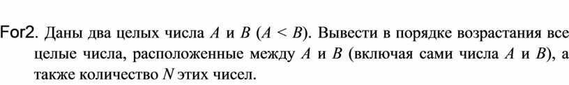 For2. Даны два целых числа A и B (A < B). Вывести в порядке возрастания все целые числа, расположенные между A и B (включая сами числа A и B), а также количество N этих чисел.