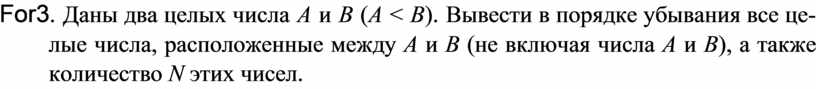 For3. Даны два целых числа A и B (A < B). Вывести в порядке убывания все це-лые числа, расположенные между A и B (не включая числа A и B), а также количество N этих чисел.