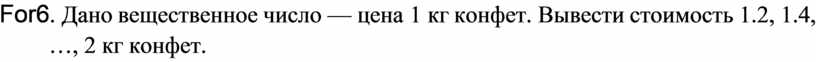 For6.Дано вещественное число—цена1кг конфет.Вывести стоимость1.2,1.4, …, 2 кг конфет.