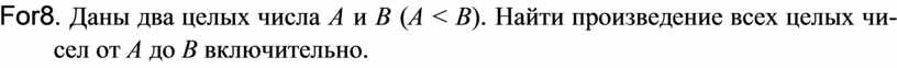 For8. Даны два целых числа A и B (A < B). Найти произведение всех целых чи-сел от A до B включительно.
