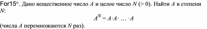 For15°. Дано вещественное число A и целое число N (> 0). Найти A в степени N: