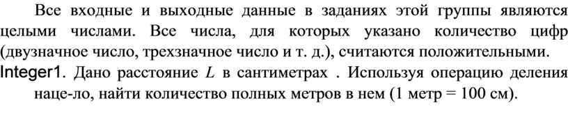 Integer1. Дано расстояние L в сантиметрах . Используя операцию деления наце-ло, найти количество полных метров в нем (1 метр = 100 см).