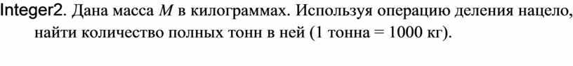 Integer2. Дана масса M в килограммах. Используя операцию деления нацело, найти количество полных тонн в ней (1 тонна = 1000 кг).