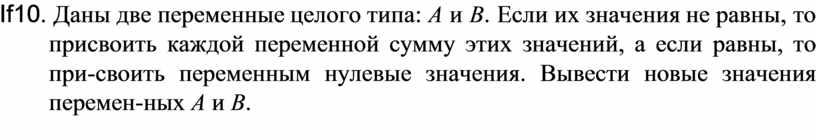If10. Даны две переменные целого типа: A и B. Если их значения не равны, то присвоить каждой переменной сумму этих значений, а если равны, то при-своить переменным нулевые значения. Вывести новые значения перемен-ных A и B.